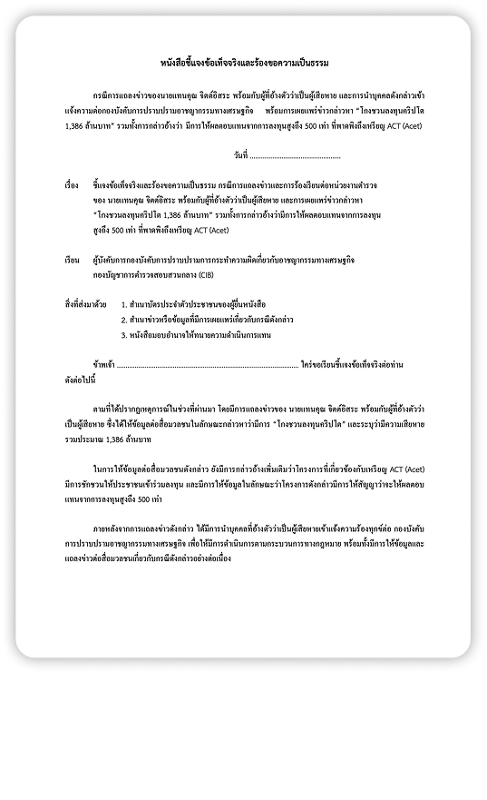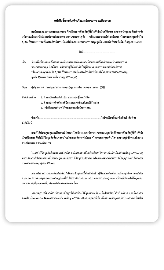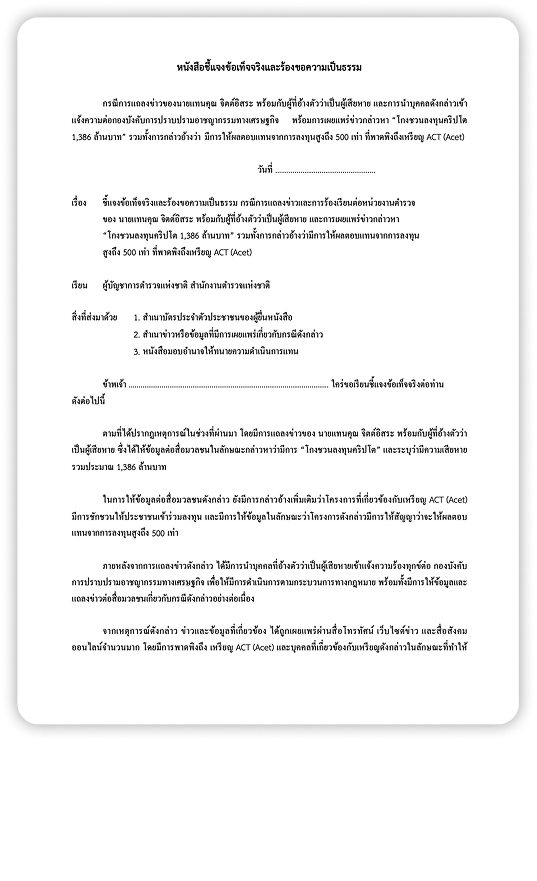 และยินยอมให้ใช้ข้อมูลดังกล่าวประกอบหนังสือชี้แจงข้อเท็จจริงต่อหน่วยงานรัฐและสื่อมวลชนตามวัตถุประสงค์ของหนังสือฉบับนี้